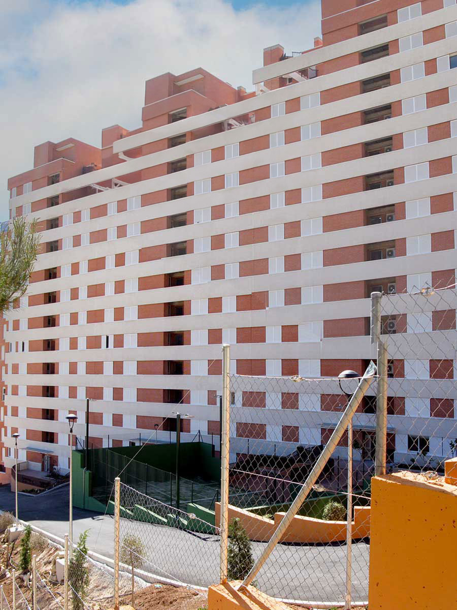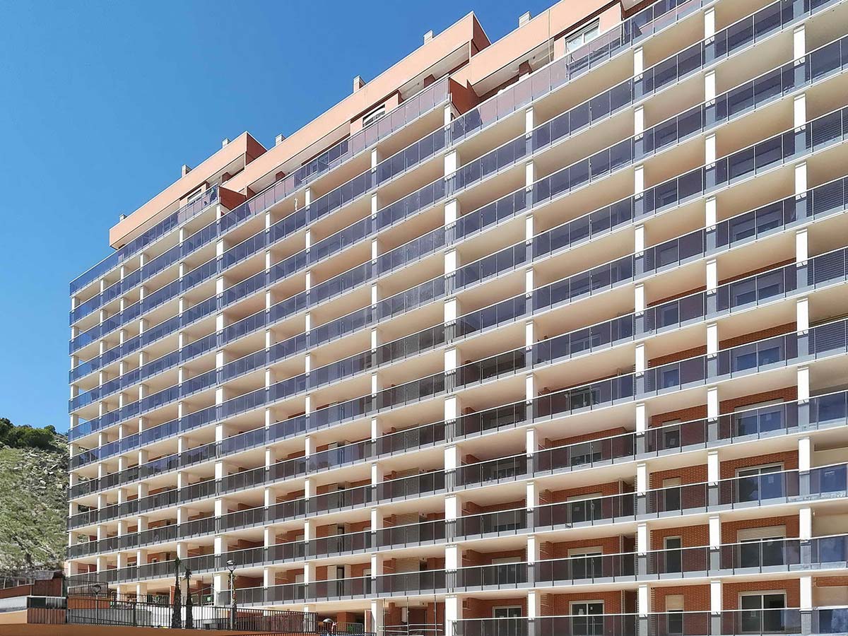 Complejo residencial compuesto por 108 viviendas en 12 plantas sobre rasante y 108 plazas de aparcamiento con 112 trasteros en 5 plantas de sótanos, urbanización comunitaria dotada de piscinas, jardines y pistas deportivas, ubicado en el sector Cales i Atalaies, muy próximo a la Cala de Finestrat.